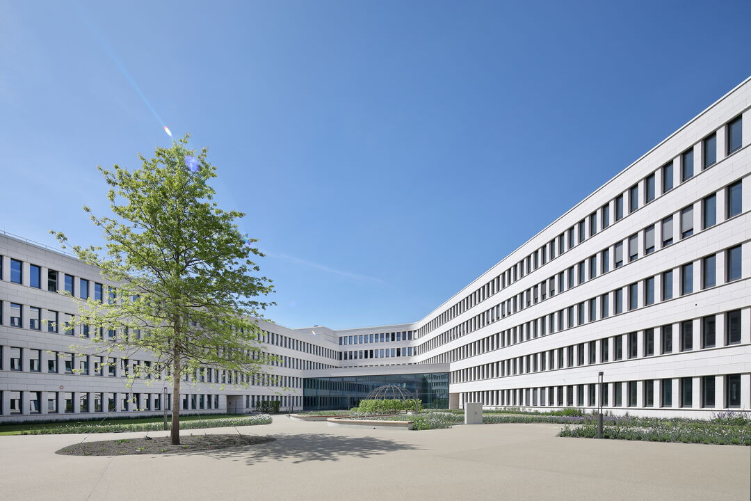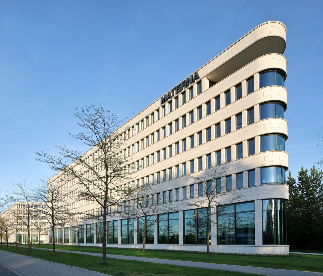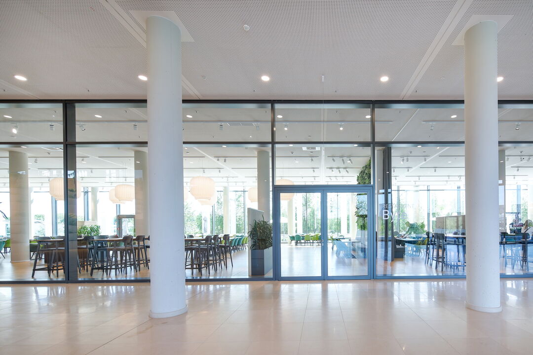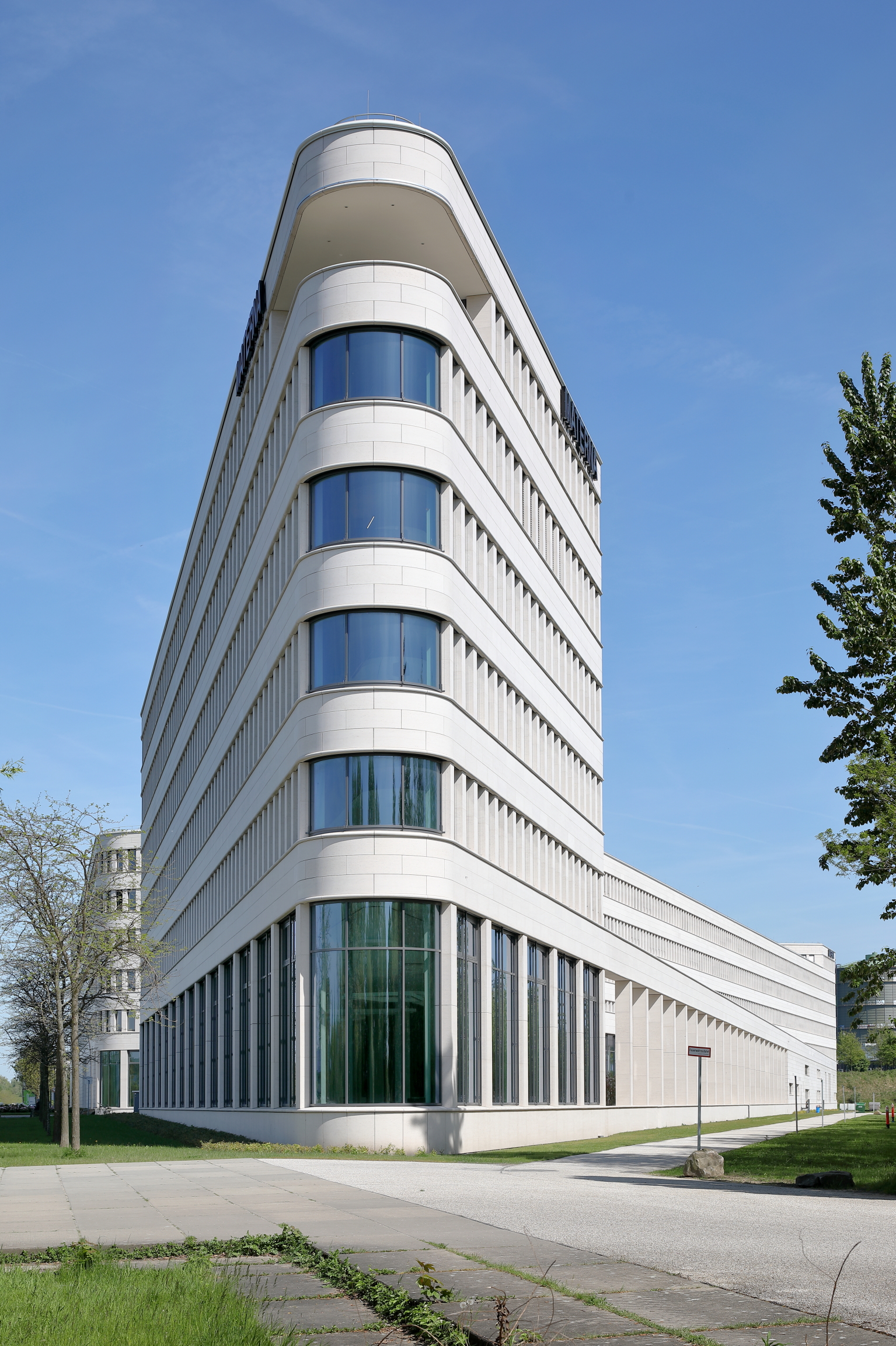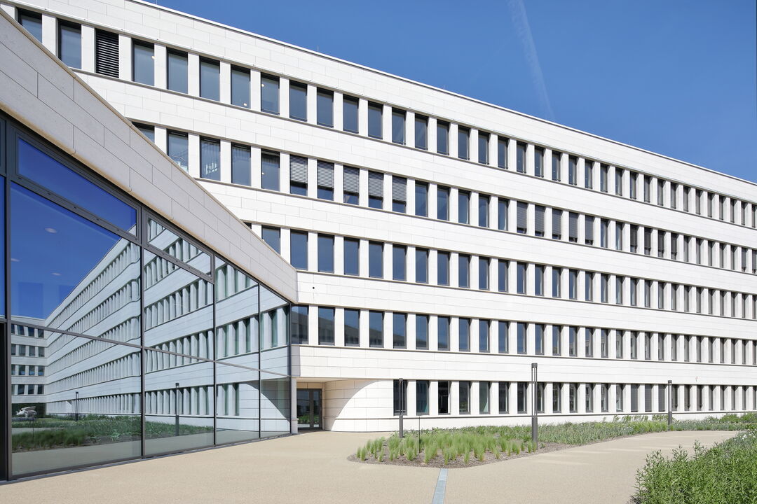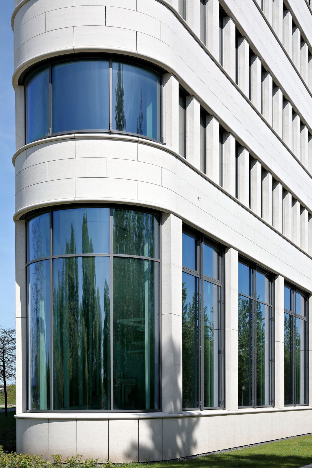 - 1.771 m² – Pfosten-Riegel-Warmfassade Schüco FWS 60 SI, teils mit gebogenen Scheiben