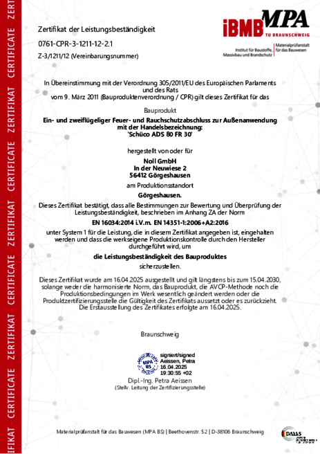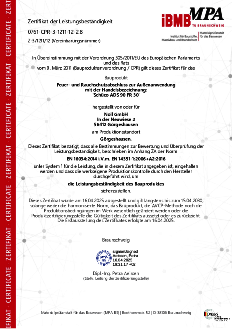Zertifikat Leistungsbeständigkeit Außenanwendung - ADS 90 FR 30