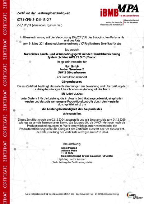 Zertifikat Leistungsbeständigkeit NRWG- AWS 75 SI TipTronic