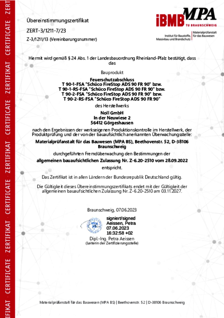 Übereinstimmungszertifikat T90-1-FSA + RS_FireStop ADS 90 FR 90