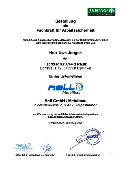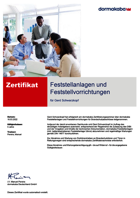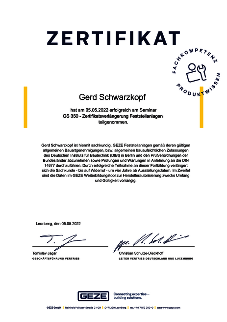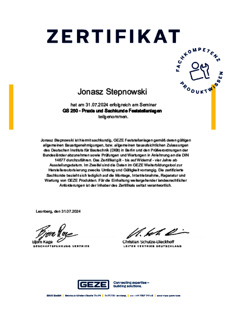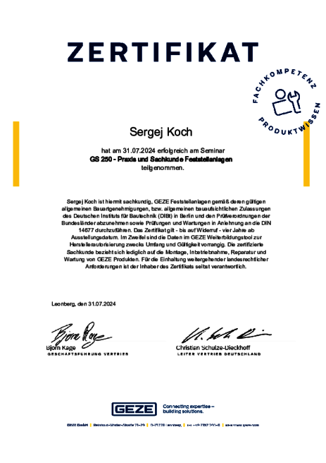 Zertifikate Sachkundenachweis zu Feststellanlagen und Elektrofachkraft