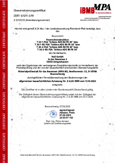 Übersteinstimmungszertifikat T30-1-FSA + RS_Firestop ADS 90 FR 30