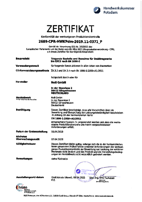 Zertifikat zur werkseigenen Produktionskontrolle "tragende Bauteile und Bausätze für Stahltragwerke bis EXC2 nach EN 1090-2"