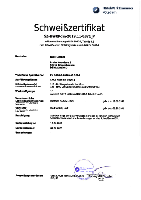 Herstellerqualifikationen/Schweißzertifikat EN 1090-2
